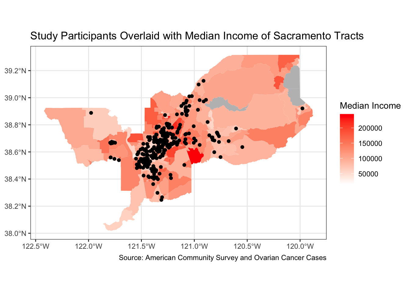 In this lab, we are going to work with vector data, which we’ve talked about last week. We are going to work with a dataset of cancer patients across California, as well as Census data on socioeconomic factors. We will also talk about geocoding addresses and will discuss how to visualize data.