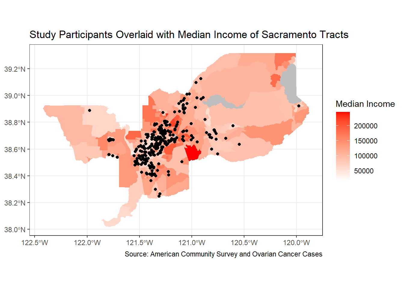 One last step. Let’s put all our knowledge together and map our old friend CAdata on top of the NDVI data in San Francisco. First, let’s bring in the CAdata dataset on ovarian cancer cases again.